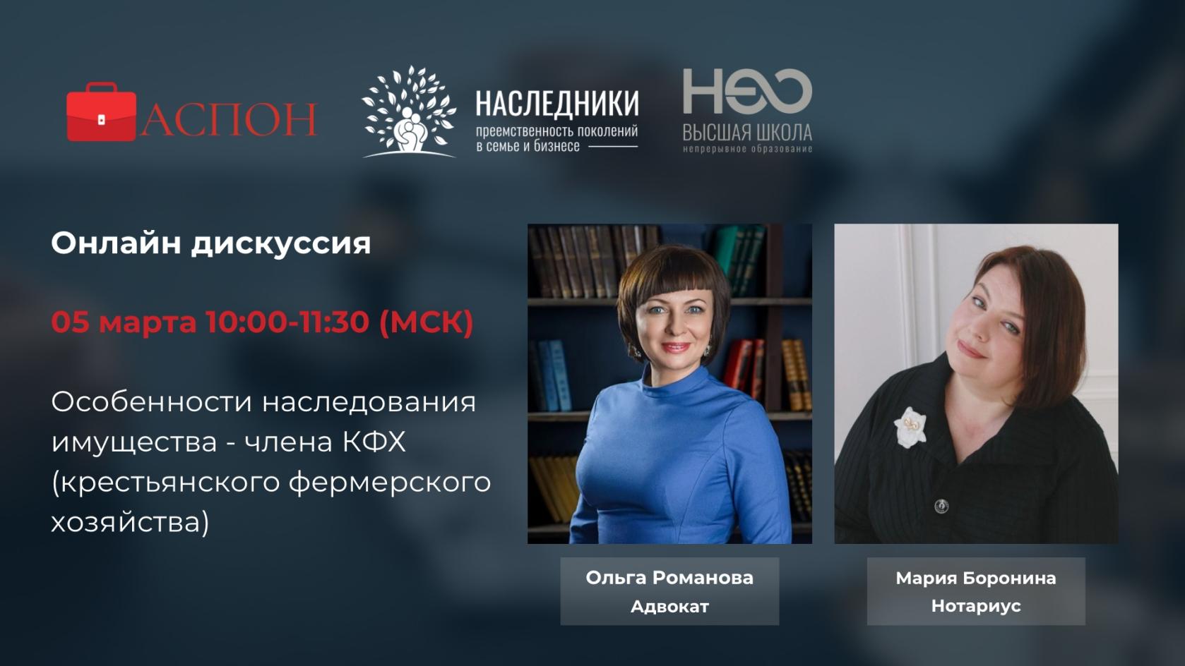 05 марта 2025 года в 10:00 по московскому времени с нотариусом Марией Борониной и адвокатом Ольгой Романовой мы обсудим: