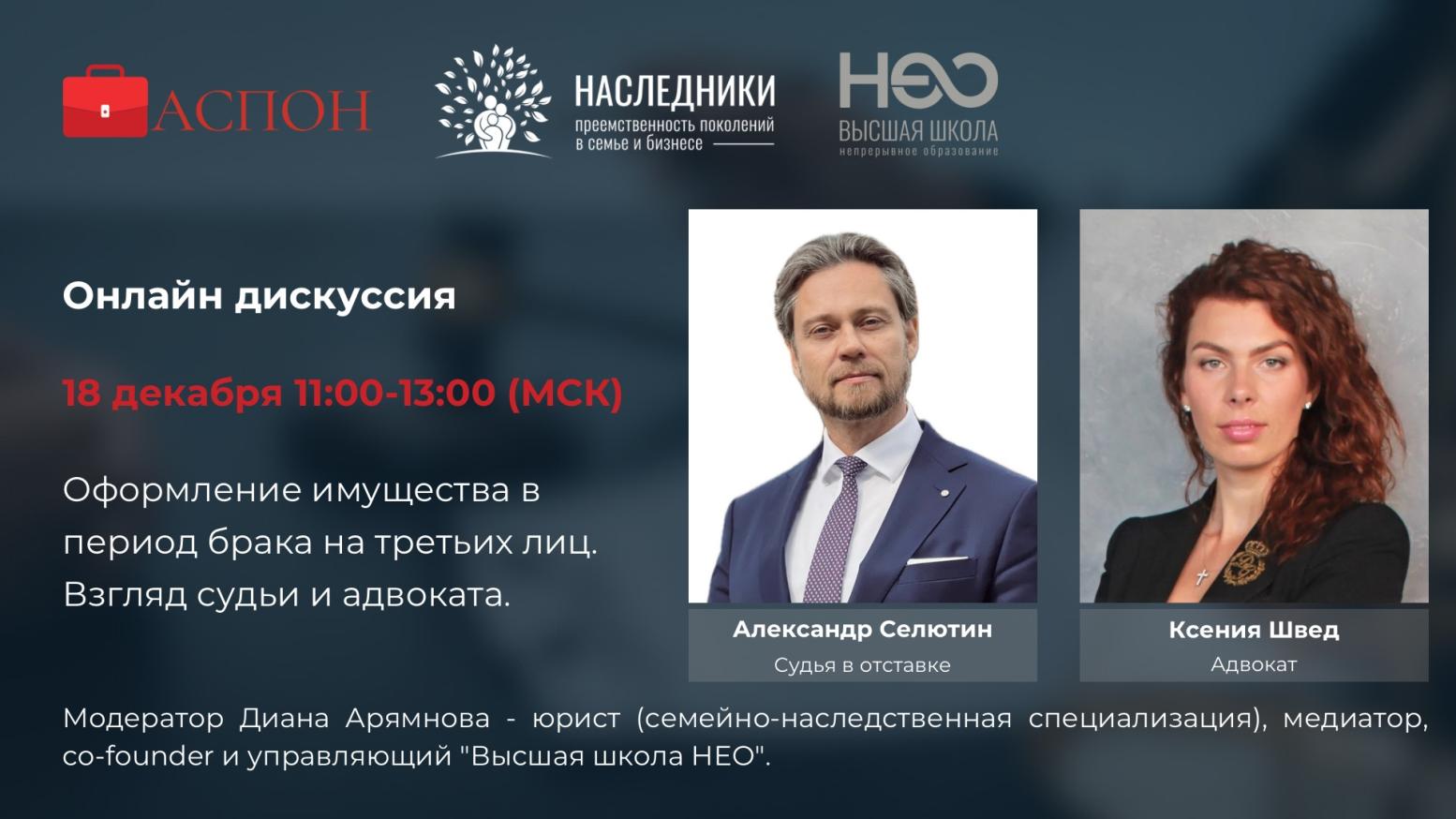 Дискуссия 18.12.2025 в 11:00 по мск времени с Александром Викторовичем Селютиным, адвокатом, к.ю.н., доцентом и судьей в отставке, а также с Ксенией Швед, адвокатом, к.ю.н, медиатором и членом международной ассоциации семейных юристов IAFL.